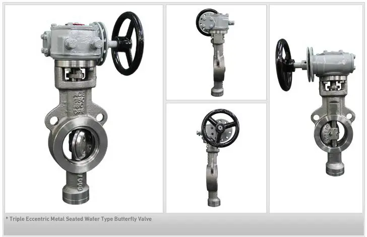 Metal seated high pressure butterfly valves provide bi-directional bubble tight shut off which achieved by introducing state of the triple eccentric disc geometry The valve shaft is off set against the seat and the centre line of the valve body respectively. The seating edges are machined with a continuously changing slope from an angle on top of the oval seat ring to an angle at the opposite side. This geometry ensures that the seat ring stays clear of the seat except at the final shut off position which results long life seat.